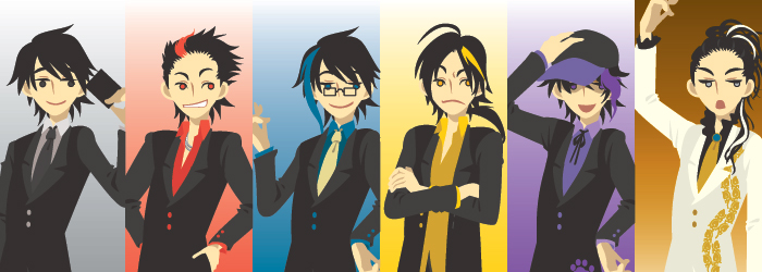 何をトチ狂ったのかスーツ姿で全員集合。 亀から描き始め、それを元に 青→金→赤→紫→プラット→王子 の順に作成。 本当はそれぞれOPのような格好をさせたかったのですが、 面倒くさ(ゲフン) 追伸:更新停滞三日坊主の癖にブログ借りてみました。